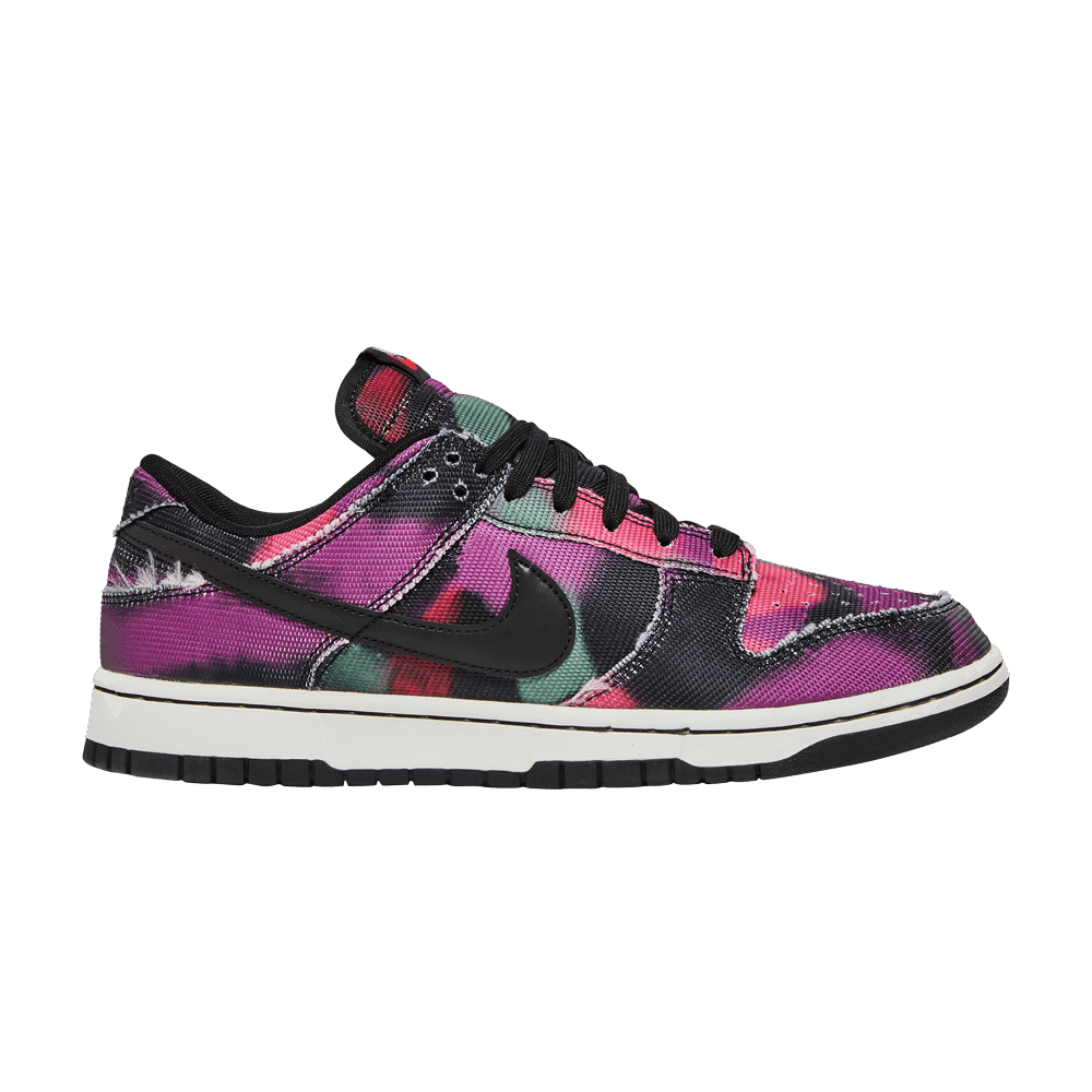 The Nike Dunk Low Premium ‘Graffiti’ features a canvas build with frayed edges and a mixed blend of pink, purple, grey, and black, rendered in a unique arrangement that makes no two shoes alike. Graffiti-style Nike branding adorns the shoe’s custom sockliners, while a reflective Swoosh adds a hi-vis element to the street-ready design. A contrasting white finish is applied to the rubber midsole, accented with contrast black stitching and supported by a black rubber outsole.