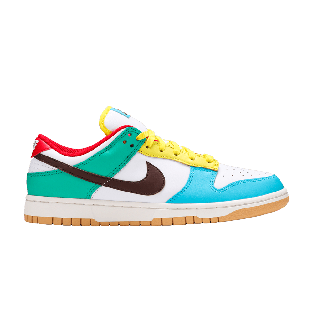 Dropping as part of the ‘Free.99’ pack, the Nike Dunk Low SE ‘White’ features mismatched color blocking between the left and right shoe. The jumbled hues — spanning a discordant mix of red, green, yellow and powder blue — are contrasted by a white leather base, a matching white textile tongue and a brown leather Swoosh. Inside the shoe, the custom sockliner displays ‘Free .99’ price stickers. Both shoes are supported by a clean white midsole and peach-colored rubber outsole.