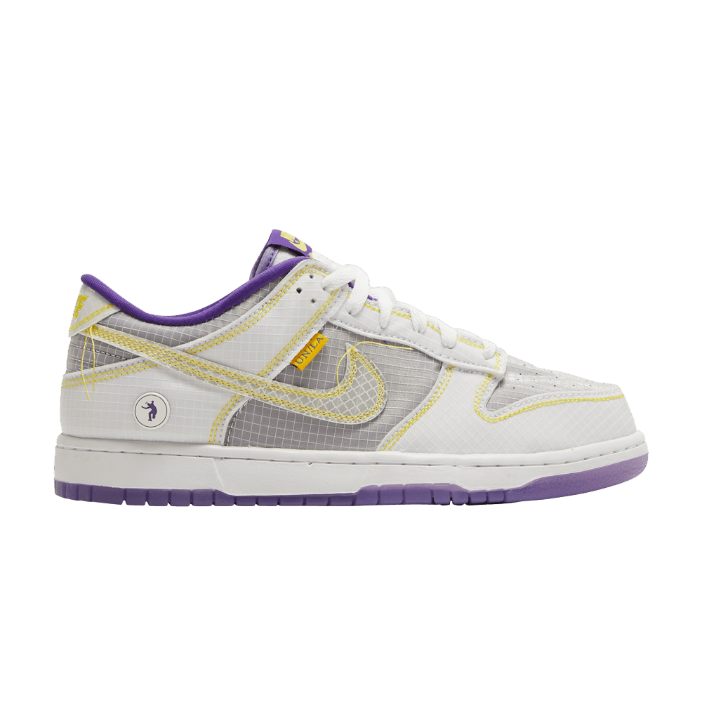 The Union LA x Nike Dunk Low ‘Court Purple’ showcases a combination of colors inspired by Los Angeles’ storied NBA franchise. The upper is constructed from semi-translucent ripstop textile that reveals a purple underlay on the toe box, quarter panel and collar. The same gridded design is applied to the forefoot and heel overlay, rendered in a solid white finish with contrast yellow stitching. More yellow stitching is applied to the patterned Swoosh, complete with excess hanging threads for a DIY-inspired look. A yellow ‘UN/LA’ tag decorates the quarter panel, while a circular emblem on the lateral heel displays the retailer’s OG Frontman logo. The distinctive silhouette makes a repeat appearance under the translucent purple rubber outsole.